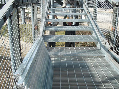 樓梯鋼格板是由鋼格板加工而成的(鋼格板是用扁鋼按照一定的間距和橫桿進(jìn)行交叉排列,并且焊接成中間帶有方形格子的一種鋼鐵制品)。該產(chǎn)品表面一般用熱鍍鋅、電鍍鋅處理。